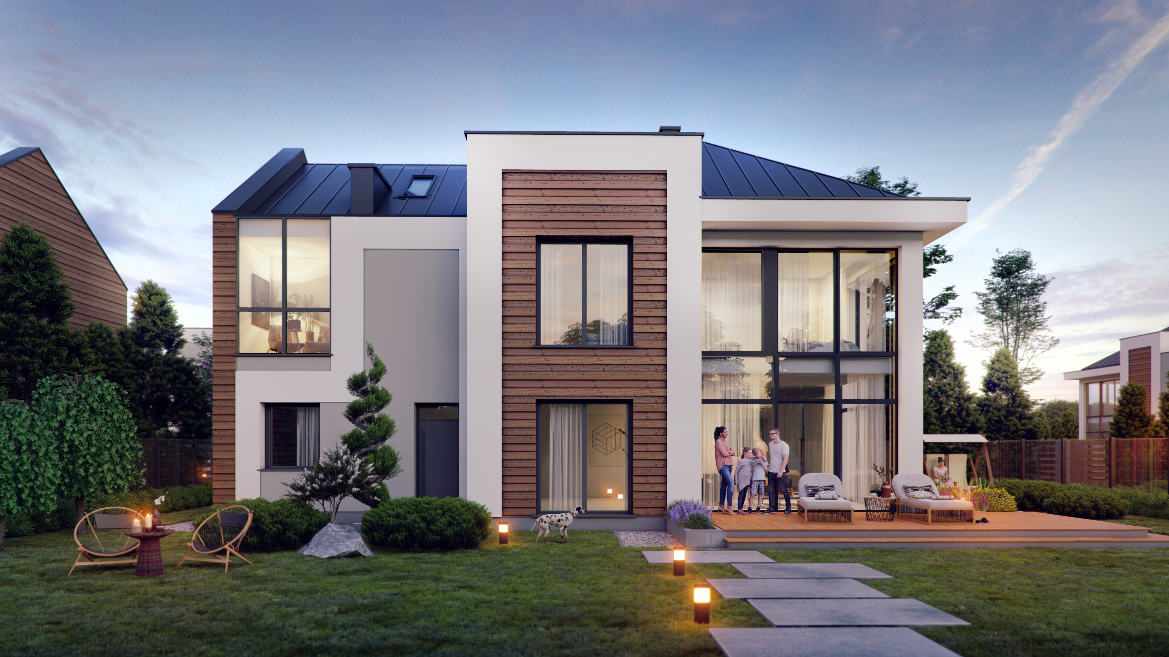 Komfortowe przestrzenie, zarówno w poziomie - obszerne piętra, jak i w pionie - wysokie pomieszczenia. Ciemnoniebieskie dachy i ogrodzenia, biel ścian i jasny beż dekoracyjnych elementów elewacji to harmonijny kolorystycznie efekt. Minimalistyczny styl, proste linie fasad przełamane skosami dachów dodają wyrafinowanej elegancji. Wnętrza są jasne i przyjazne dzięki dużym przeszkleniom.